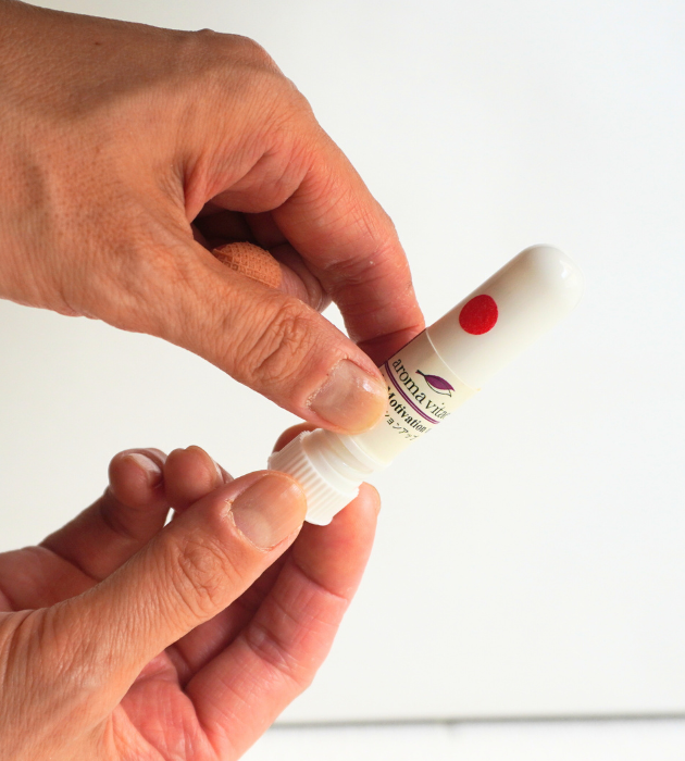 片方の鼻を指で軽く押さえ、もう片方の鼻にインヘラーを入れて吸い込みます(香りを吸い込むことで、成分がしっかり鼻腔に届きます)。