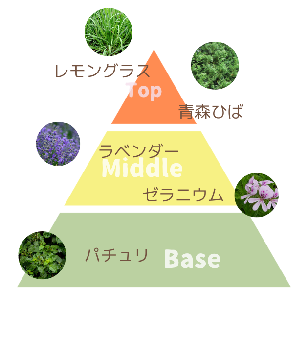ゼラニウム、ラベンダー、レモングラス、パチュリ、青森ひばー