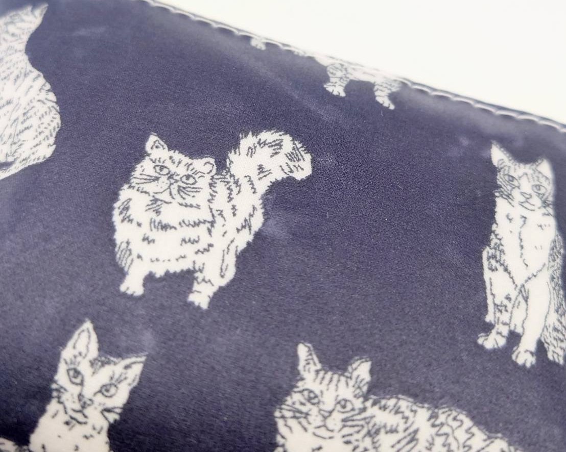 表地には、ふわふわの毛並み、きらりと光る瞳、そして気まぐれな仕草。猫好きにはたまらない、 Meow(ミャオウ)デザインの生地を使用し、裏地はグリーンのストライプ柄のブロード(綿)生地を使用しています。